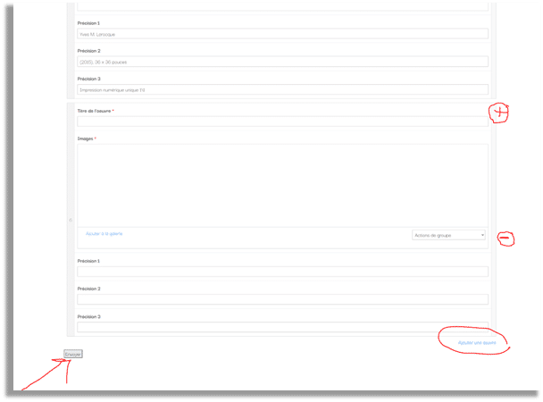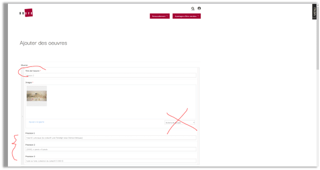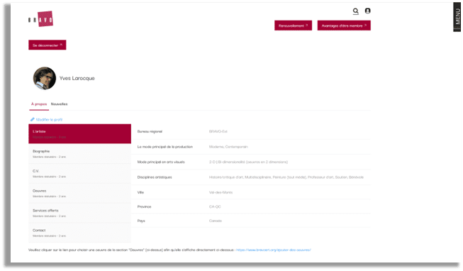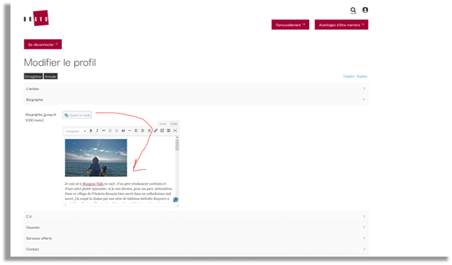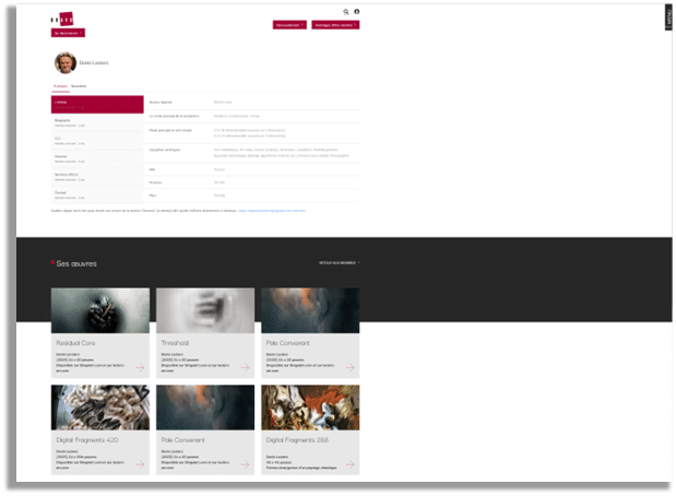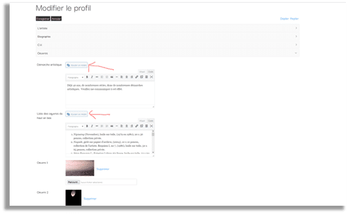 Pour bénéficier de ce service, il est nécessaire de soumettre à la direction générale un document Word structuré avec les titres suivants : une courte biographie de 60 mots, une plus longue biographie qui ne dépasse pas 1000 mots, une démarche artistique ne dépassant pas 500 mots et 6 œuvres qui ne dépassent pas 500 K chacune. Chacun des fichiers images doit être titrer de la manière suivante avec les traits de soulignement.
